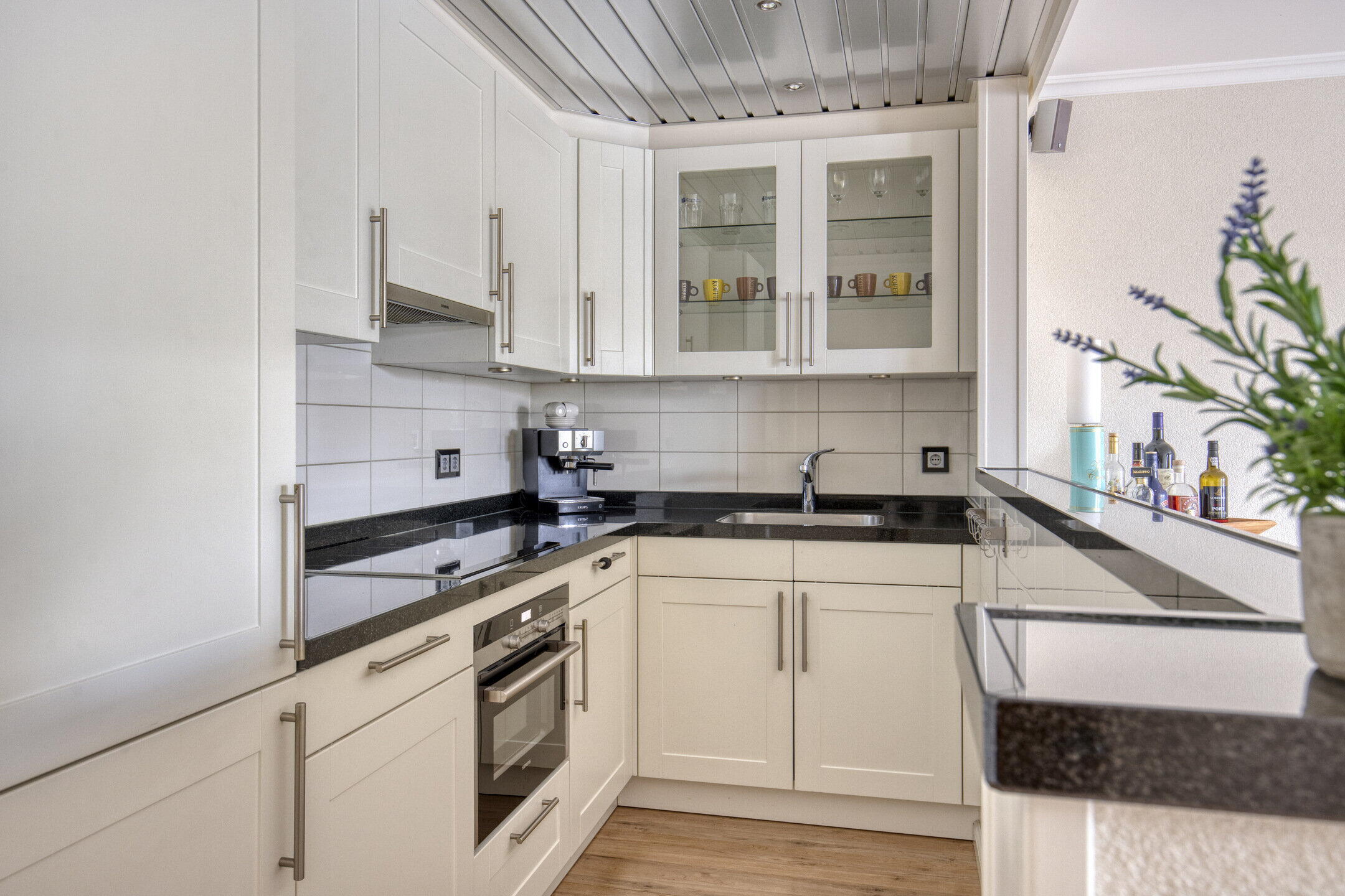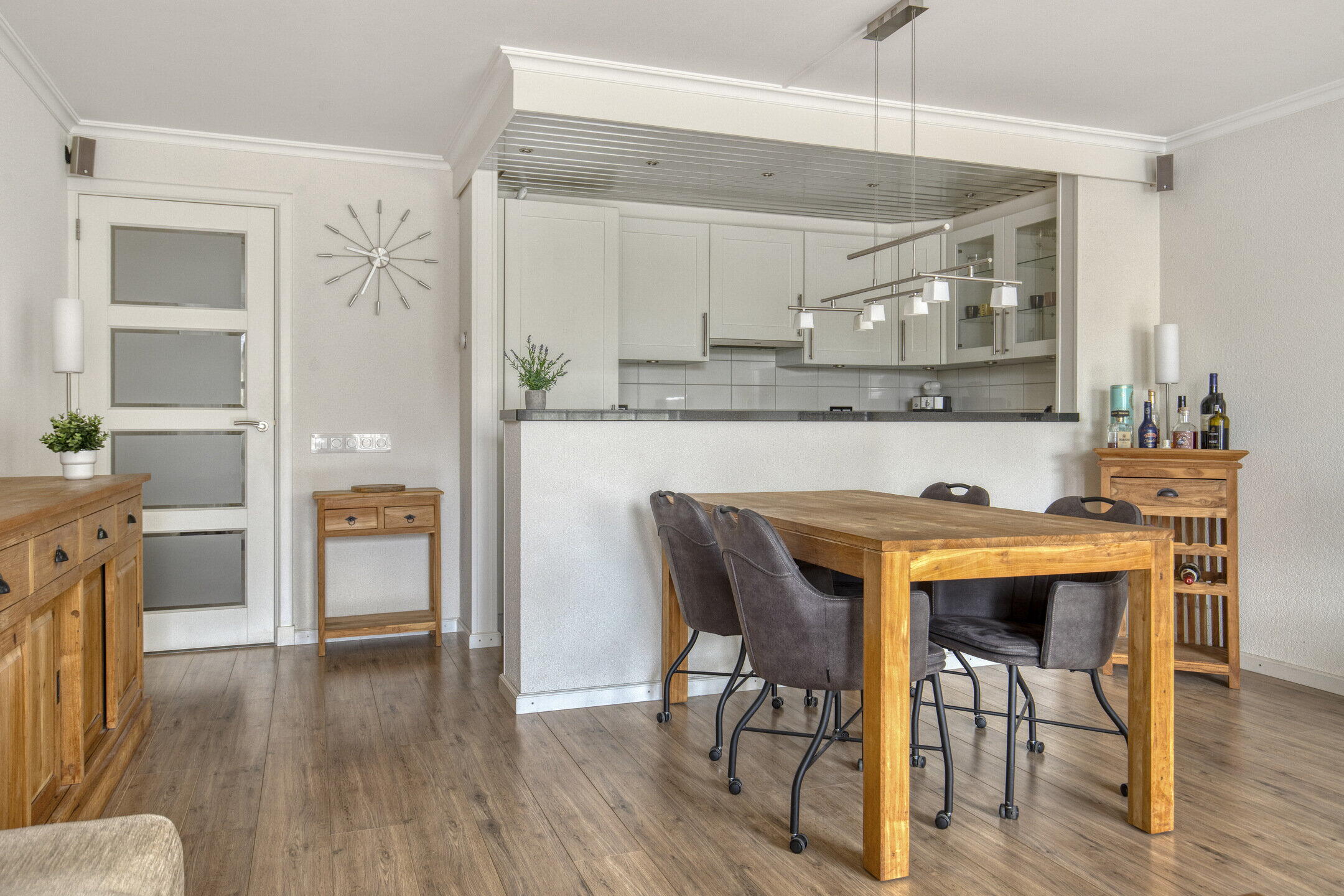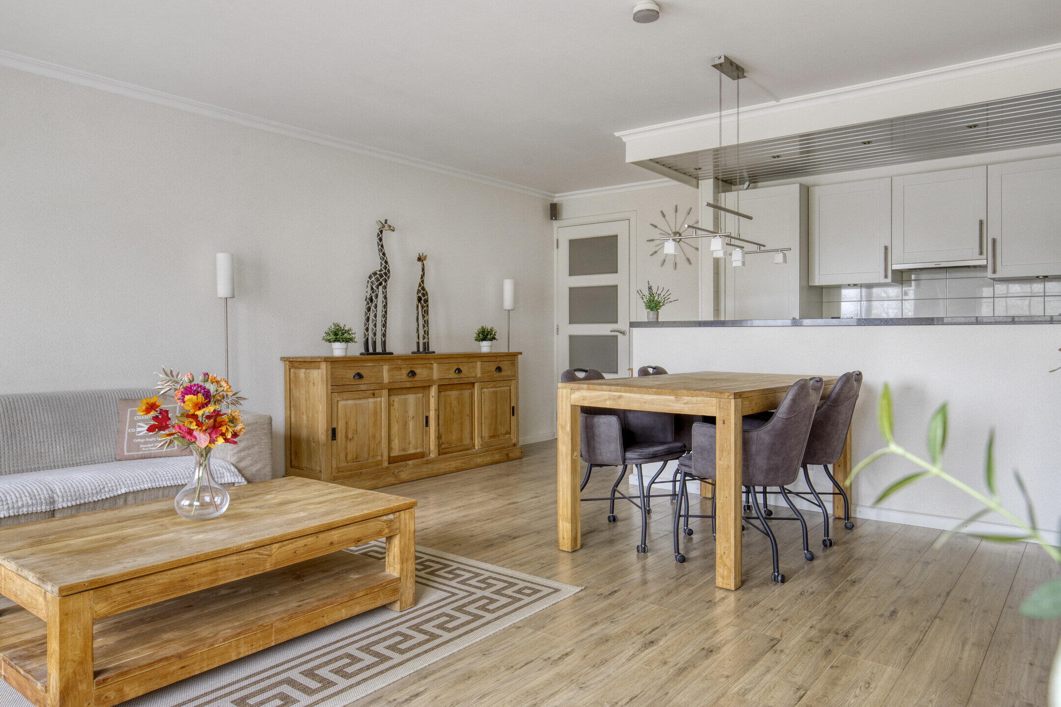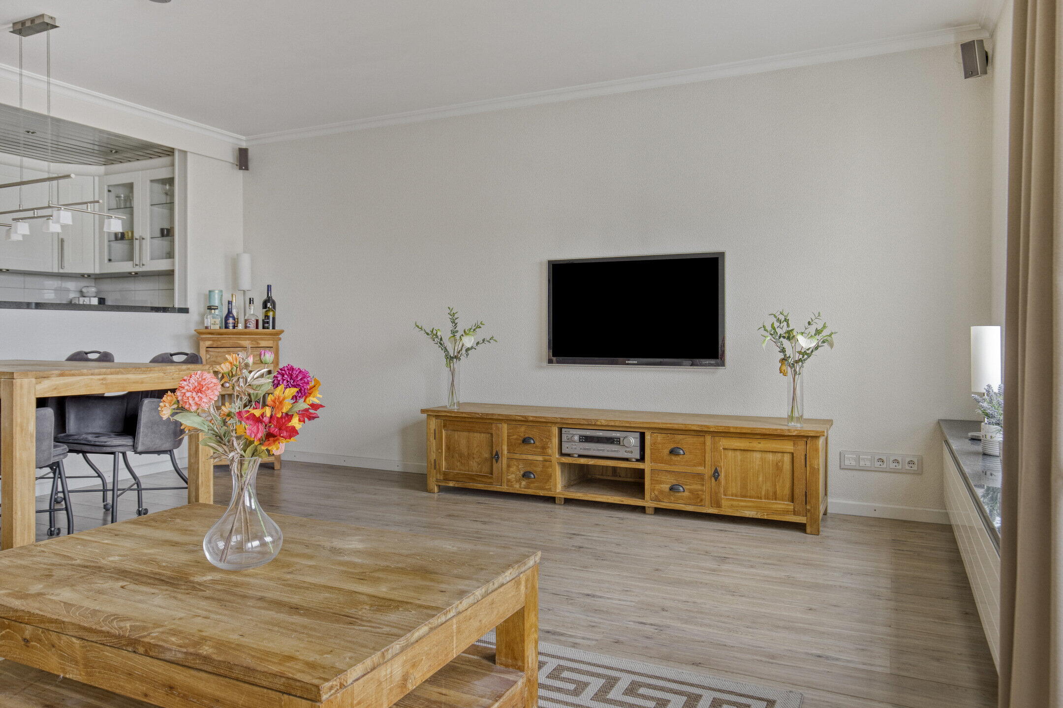 De woonkamer is de perfecte plek om te ontspannen. De ruimte is licht en gezellig en biedt voldoende plaats voor zowel een comfortabele zithoek als een eettafel voor gezellige diners met vrienden en familie. De keuken, die direct aan de woonkamer is verbonden, is praktisch ingericht. Met een inductiekookplaat, een combi oven/magnetron en een koel-vriescombinatie is deze keuken voorzien van alle gemakken.