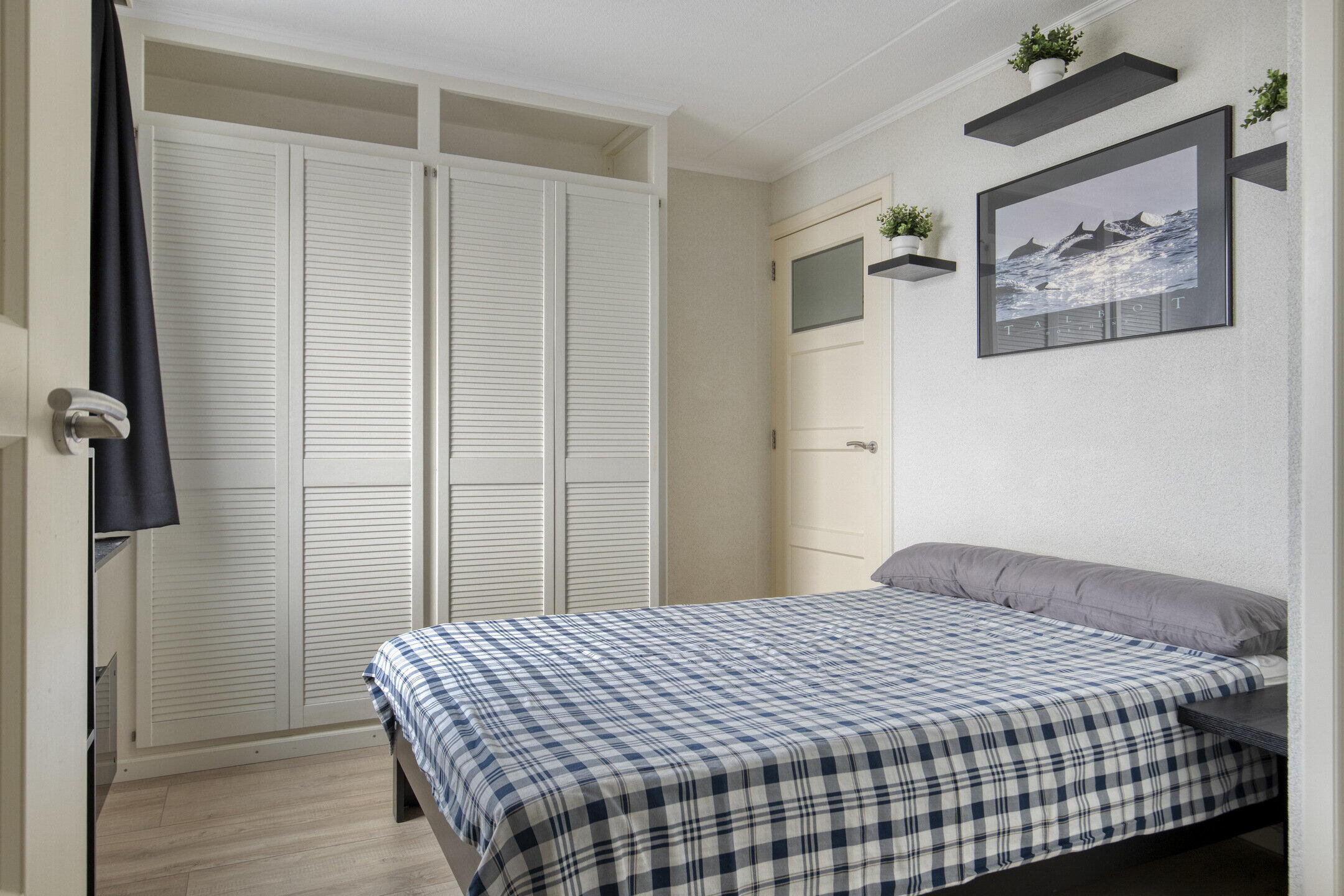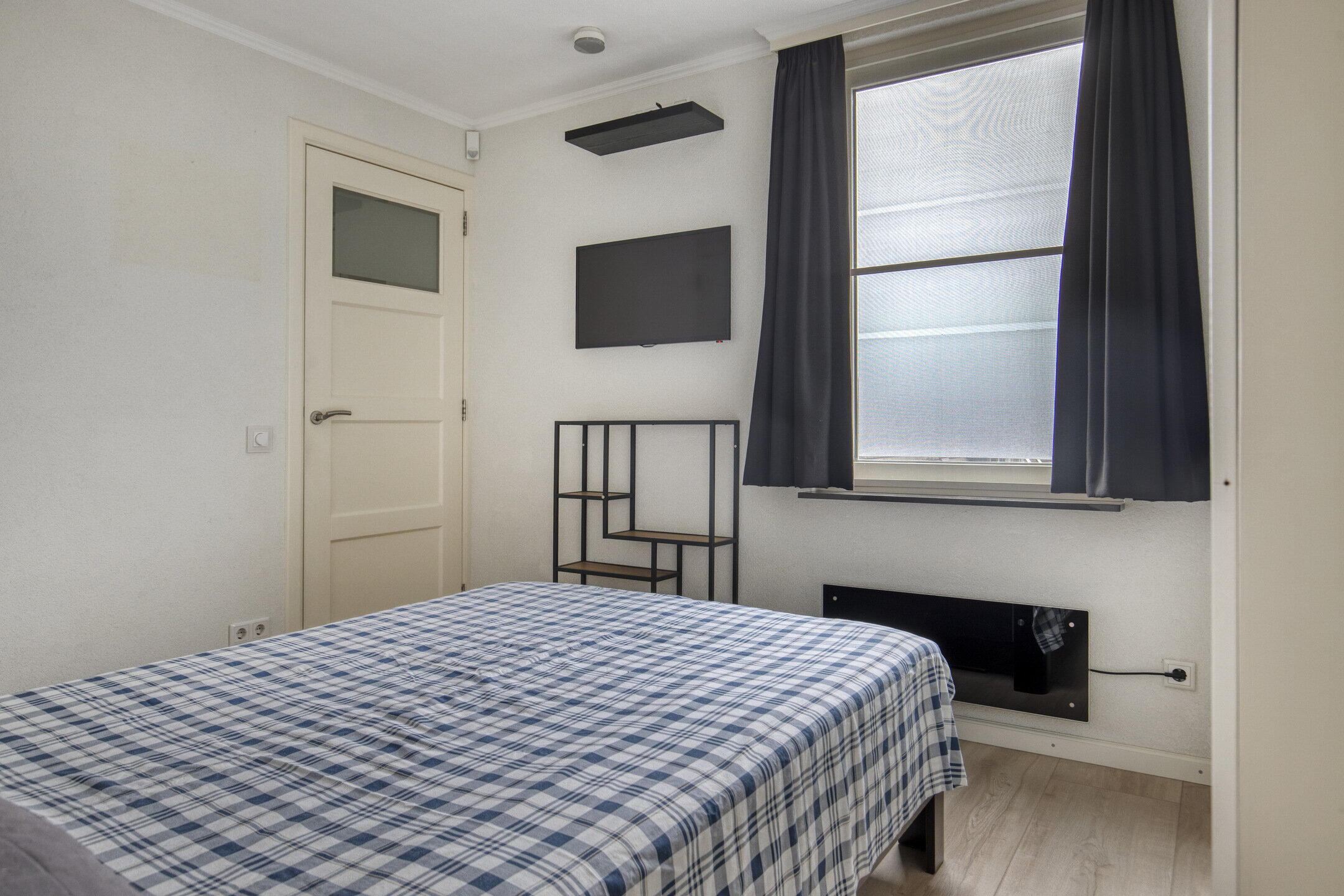 De slaapkamer biedt ruimte voor een groot bed en een kastenwand. Het grote raam zorgt niet alleen voor een heerlijke lichtinval, maar ook voor een fijne sfeer. Dankzij de slimme indeling van de kamer heb je voldoende opbergruimte en voel je je hier snel thuis.